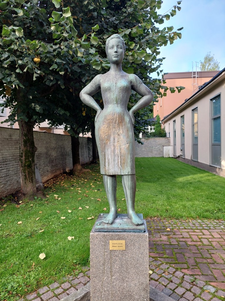 Postflickan står kvar. Fast jag blev lite besviken när jag såg att hennes systerskulptur i Eskilstuna bara heter ”Stående kvinna”. Det är som om det där med ”post” bara klistrats på. Som om hon kunde hetat ”Systembolagsflickan” eller ”Frisörflickan” om placeringen och beställaren varit en annan.