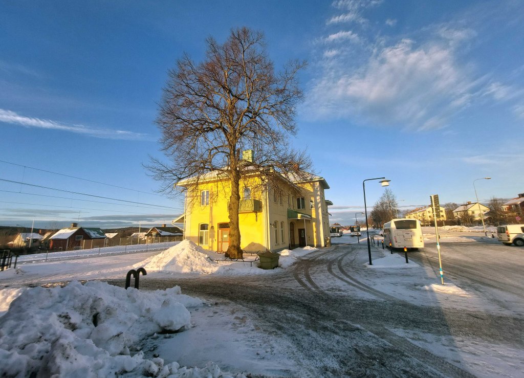 Man hinner med underbart vindlande samtal på en timme. I varje fall när man har en medresenär med öppet sinne. Tomas steg av vid Essorondellen – den som jag kallar för Centrumrondellen. Inbitna Hedemorabor håller fast vid Essorondellen/Essobacken – trots att det väl snart är femtio år sedan macken lades ner. Jag steg av vid Resecentrum. Där blev jag plötsligt alldeles lycklig. Så där lycklig som de påstår att vi mellan 65 och 70 år är. Vi som ska vara lyckligast i Sverige. Solen sken och den värmde. Det var 4-5 plusgrader och stationshuset lyste som en citron. Det var vackert och det var alldeles stilla.