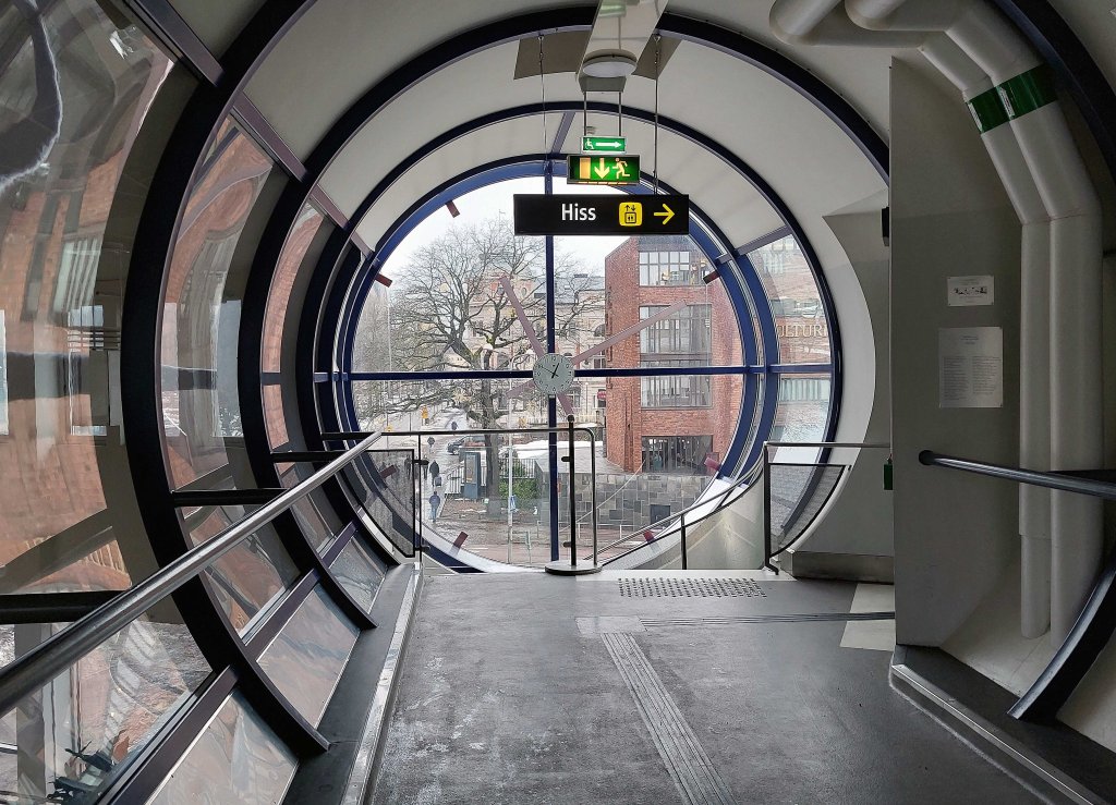 Skövde resecentrums tubformade spårövergångar kunde varit med i någon film av Jacques Tati.