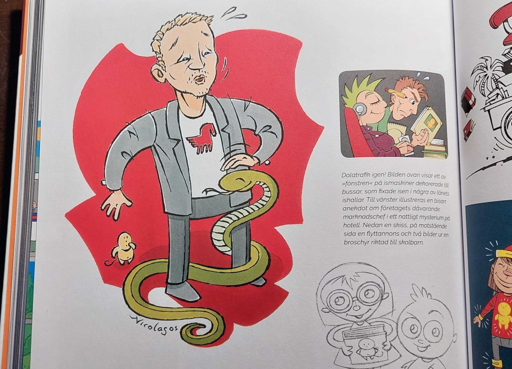 I Skövde fanns också de ”kreativa kompisarna” på Factum reklambyrå. Désirée, Nicolas, Jessica och Nils-Åke lärde mig det mesta jag kan om att göra tidtabeller, skriva informationstexter och om grafisk design. Nicolas gjorde väldigt många illustrationer och serier för Dalatrafik och var en viktig del av vårt varumärke under de gyllene åren på 90 och 00-talet.