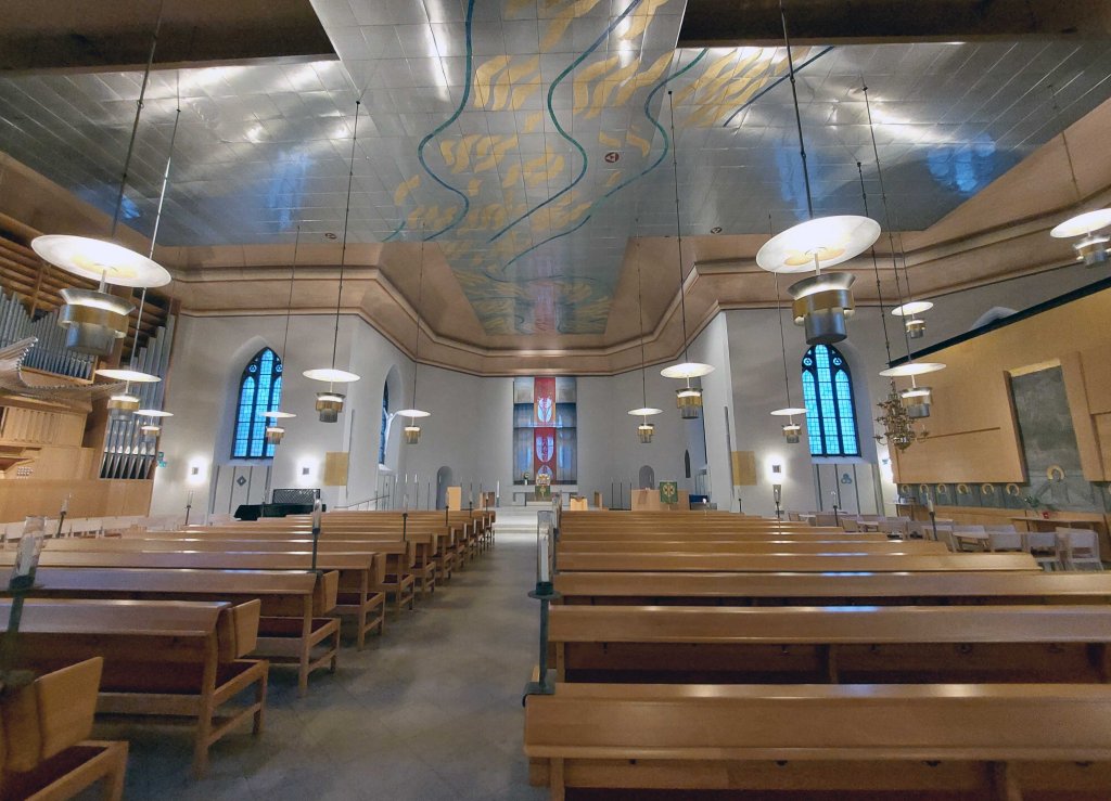 Sankta Helena kyrka. Den gamla kyrkan är hårt restaurerad men kyrkorummet gav en skön känsla av rymd och stillhet. En vepa på vägen citerade ur Johannesevangeliet: ”Känn ingen oro och tappa inte modet”. Bibelord att bära med sig i tider som dessa.